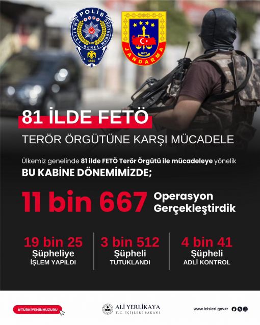 T.C. İçişleri Bakanı Ali YERLİKAYA tarafından resmi sosyal medya hesabından yapılan açıklamada; “Bu kabine dönemimizde FETÖ’ye yönelik 11 bin 667 operasyon gerçekleştirdik.